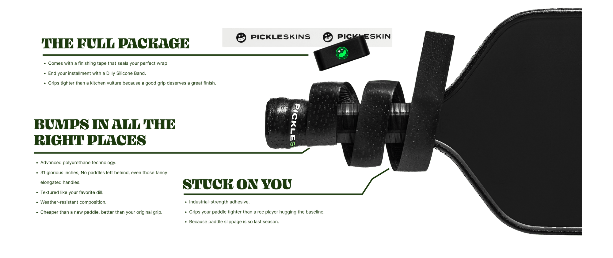 Get ready to dill out some amazing shots for a game-changing grip that sticks like a pickle to a bun! We've harnessed the very essence of pickleball wizardry to create a grip that defies the laws of slipperiness in any weather condition. Say goodbye to that plain old grip your paddle came with and upgrade to Pickleskins